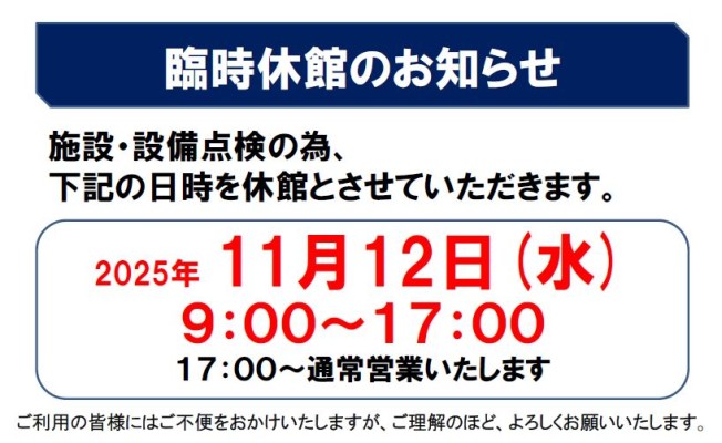 臨時休館のお知らせ(11月12日㈬ 9:00~17:00休館)