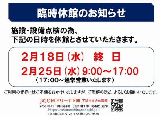 施設・設備点検の為、下記の日時を休館とさせていただきます。 2026年2月18日㈬ 終日 2026年2月25日㈬9:00~17:00 ご利用の皆様には、ご不便をおかけいたしますが、ご理解のほどよろしくお願いいたします。